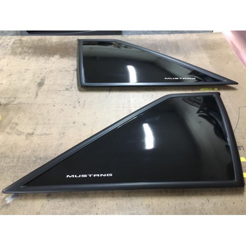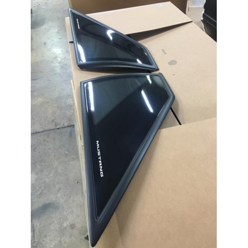 '87-'93 hatch 1/4 windows. Produced from fiberglass. Weighing a little over one lb a piece. They come with all the studs in oem locations for mounting. They come with medium tint decal (As shown) or black decals with just mustang logo. THESE ARE NON SEE THROUGH WINDOWS.. The decal on the face mimics a oem window look. They will work on '79-'86 cars with minor modifications to the early cars.